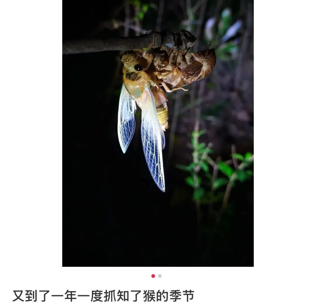 破土后,若虫需在几小时内完成 “金蝉脱壳”—— 背部裂缝→头部脱出→倒挂休息→尾部脱离,最终羽化成为成虫。