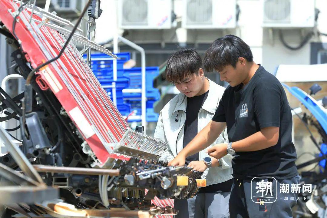 记者跟着毛佳昊,来到“窑望丰赢”农事服务中心,空地上5台插秧机一字排开,轮子上泥土未干。25岁的农创客肖飞正拿着水管冲洗车轮,一见毛佳昊就喊:“皮带和齿轮有点磨损了,你快来看看。”