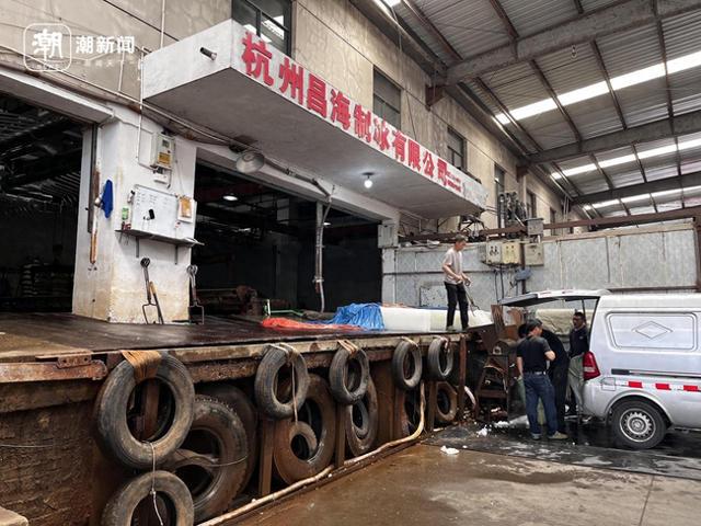6月30日一大早,位于杭州余杭区博园路的杭州昌海制冰有限公司内一派忙碌的景象。工人们手拿着长钳,将一块块结实的冰块顺着高高的台子推到前来装冰的车子上。