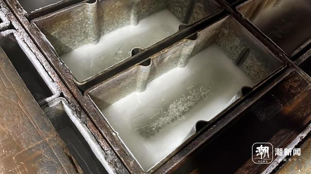 “我们的冰块是自来水做的,采用的是盐水制冰的工艺。”在装着冰块的高台后面,就是制冰区。丁礼友掀开一块垫子示意道:“这些冰还没冻好,下午三点左右才能倒出来。一般早上下午各‘起冰’一次。”
