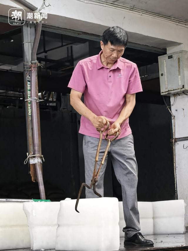 在厂子外,一辆能装载5吨货物的厢式货车格外醒目。一上午过去,台子上堆放的冰块已搬运得七七八八。工人们随后又从车厢里搬出冰块。“这算是我们的‘移动冰箱’。”丁礼友拍着车厢说,“高温天冰块在户外融化快,放车厢里反而更保鲜。”