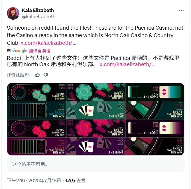 此外,这名玩家还发现,即将发布的更新将添加一个名为Pacifica Casino的全新赌场,相关文件已经添加到游戏中。