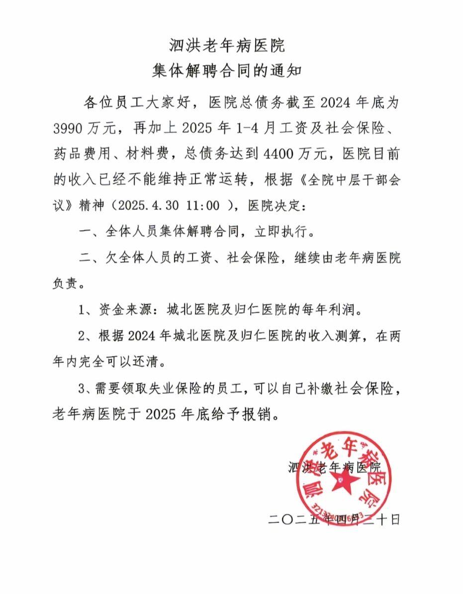 这则名为《泗洪老年病医院集体解聘合同的通知》中称,医院总债务截至2024年底为3990万元,再加上2025年1至4月工资及社会保险、药品费用、材料费,总债务达到4400万元,医院目前的收入已经不能维持正常运转。医院决定:全体人员集体解聘合同,立即执行,欠全体人员的工资、社会保险,继续由老年病医院负责。